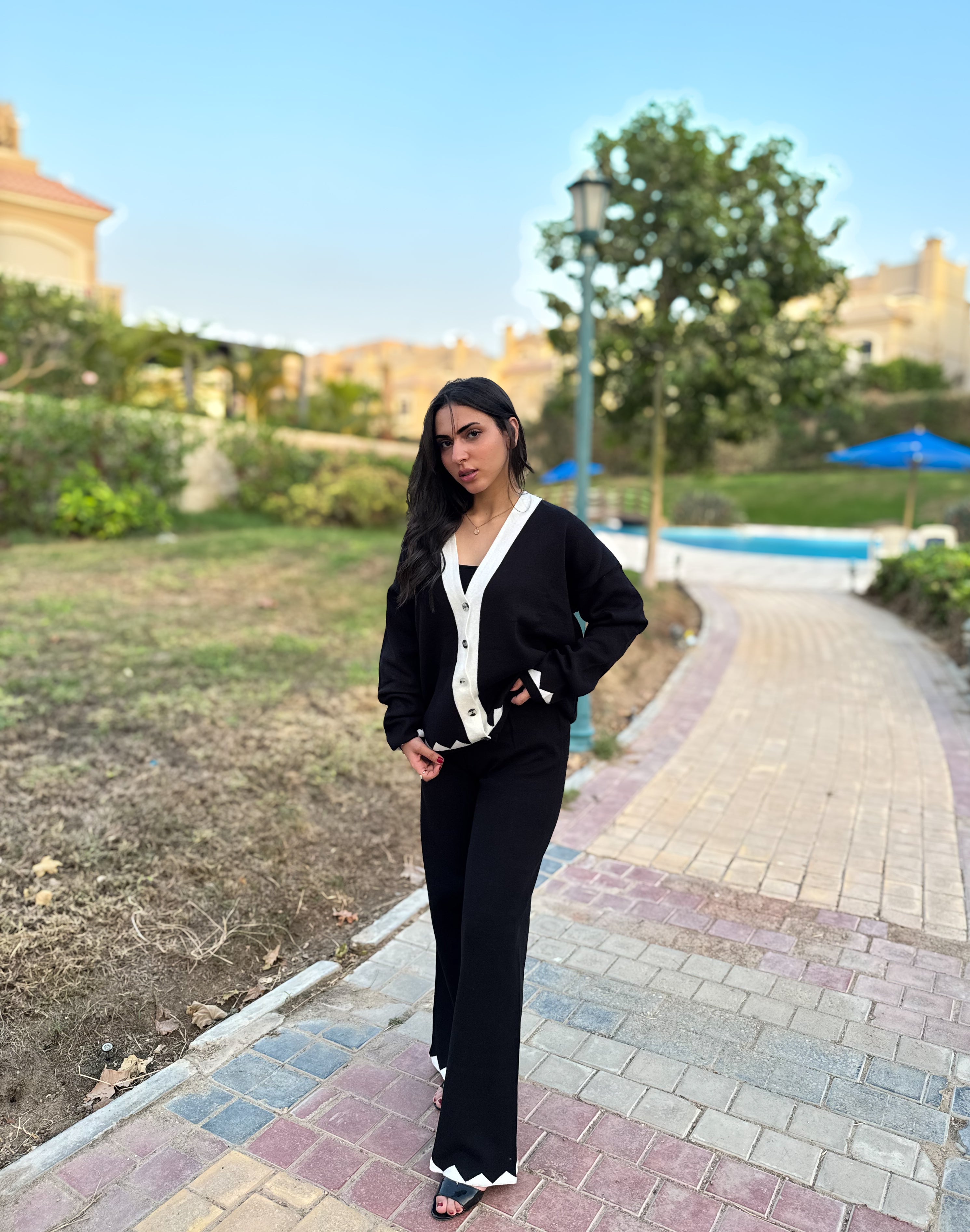 طقم من قطعتين مصنوع من نسيج ناعم ، يتألف من كارديجان بقصة مريحة وبنطال واسع الساقين متناسق، مزين بتطريزات سوداء متعرجة تضفي لمسة عصرية أنيقة.